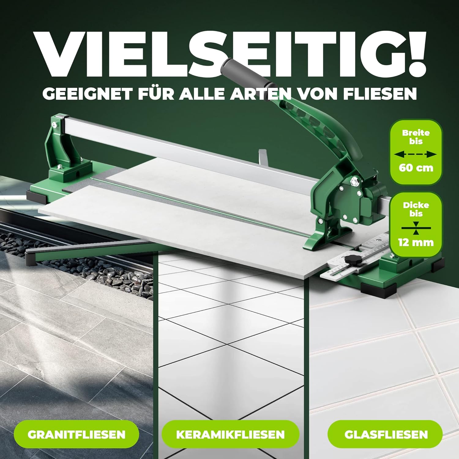 Unsere Fliesenschneider sind vielseitig einsetzbar und können Keramikfliesen, Glasfliesen und sogar Granitfliesen schneiden. Je nach gewähltem Modell können Sie Fliesengrößen von 60 cm, 80 cm oder 100 cm bearbeiten, bei einer maximalen Fliesendicke von 12 mm.
